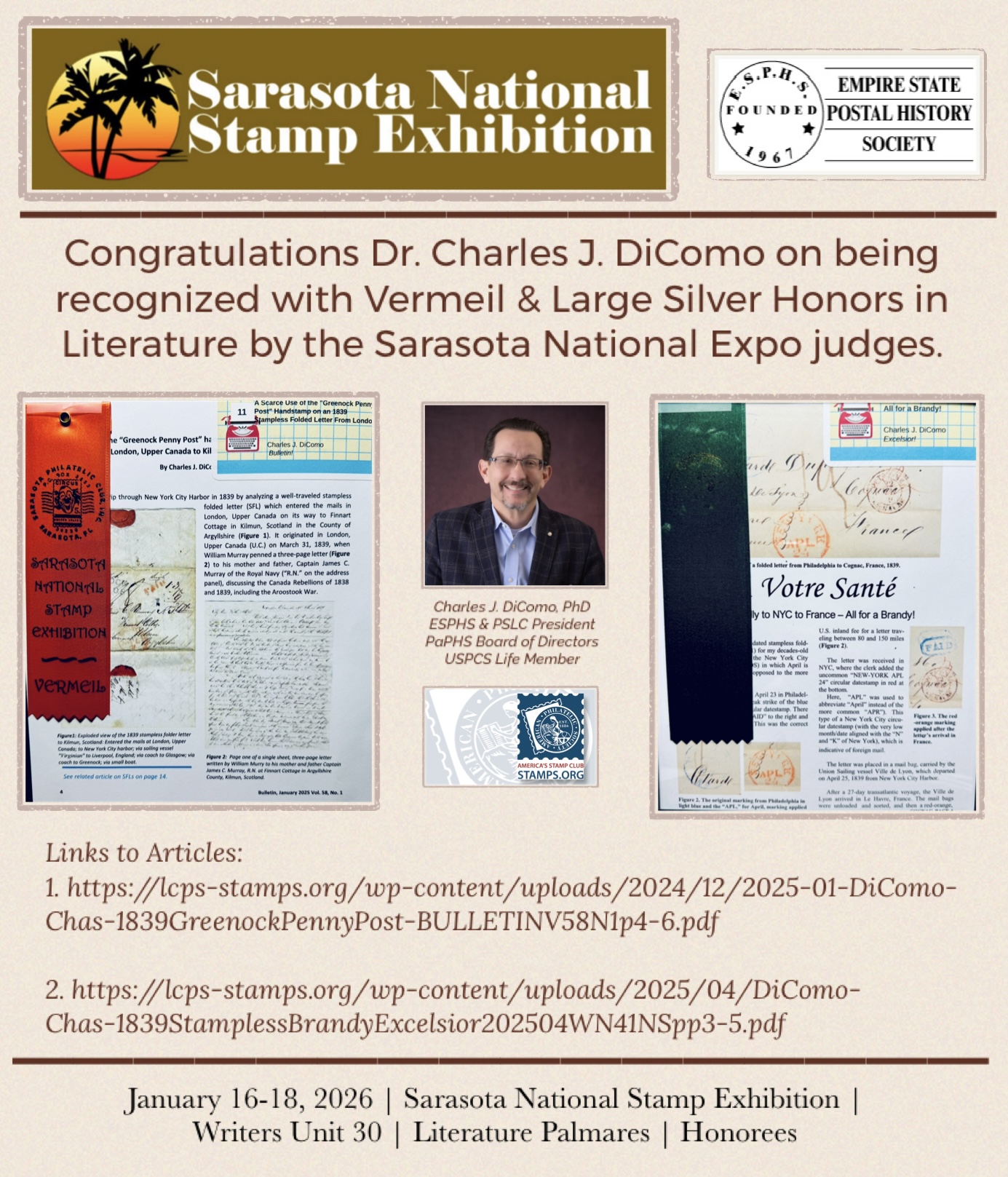 In 2026, Charles was honored with a Vermeil and Large Silver Ribbon by the judges at the Sarasota National Stamp Exhibition 2026, Literature Palmares for his original research articles. A Vermeil was awarded to “A scarce use of the ‘Greenock Penny Post’ handstamp on an 1839 stampless folded letter from London, Upper Canada to Kilmun, Scotland via New York City,”, which appeared in “The BULLETIN,” January 2025, Vol. 58, No. 1, pp. 4-6. The Large Silver went to “À Votre Santé: From Philly to NYC to France – All for a Brandy!”, which appeared in “The Excelsior!,” April 2025, Whole No. 41NS, pp. 3-5. As one colleague shared, Charles once more successfully presents his discoveries by weaving philatelic investigation into a style that allows his research to flow as a historical story… and written in a manner that captivates the readers.