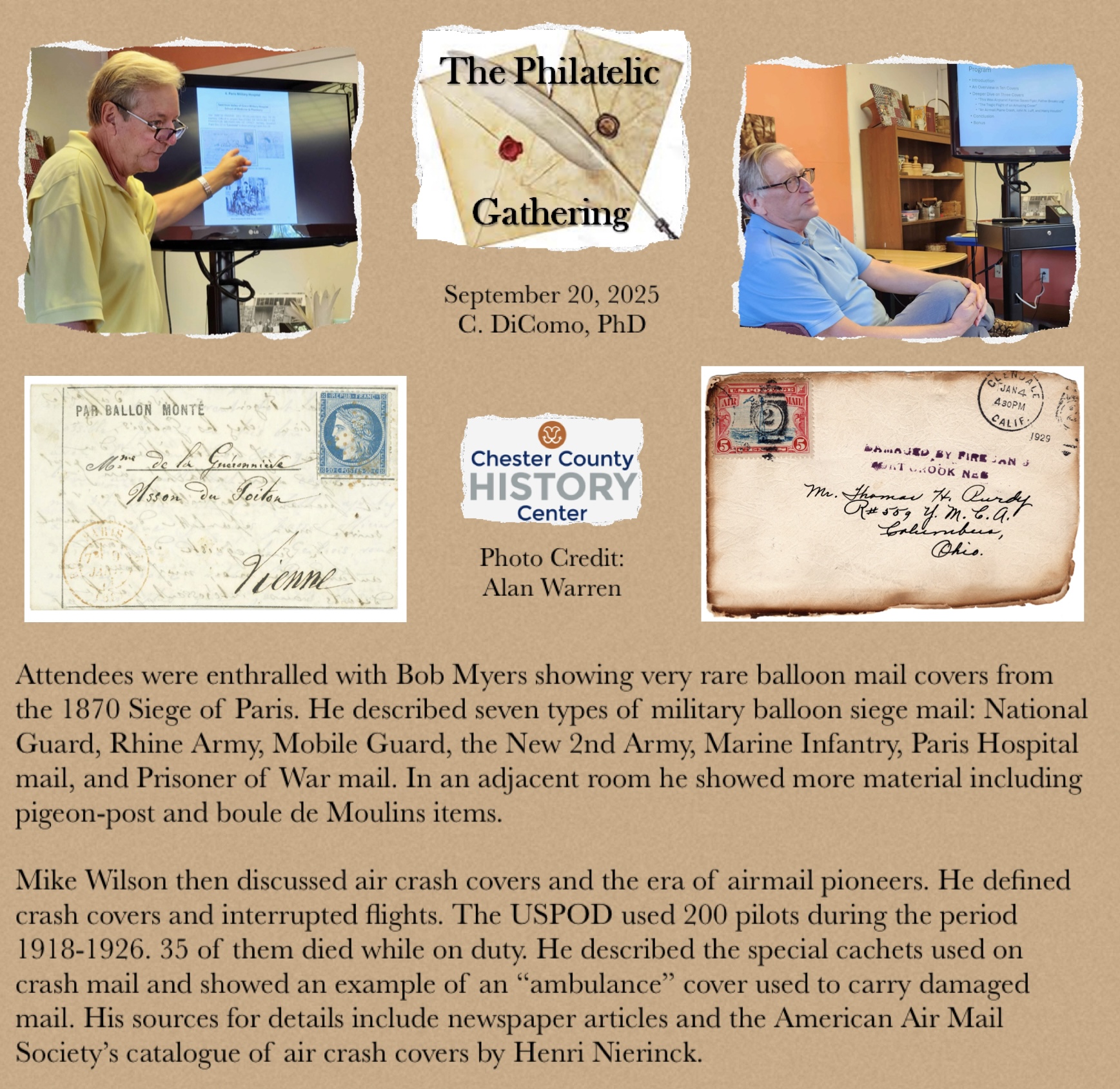 The Philatelic Gathering met October 19, 2024 at the Chester County History Center for two stellar lectures. Bob Myers showed spectacular material from his exhibit of “Siege of Paris 1870-71: Movement of Mail.” The exhibit tells the story of the balloon mail and other aspects during the four month siege. He also showed some new items that will be added to the display. Bob has material from all 54 balloon flights that carried mail as well as some that carried “entrusted” letters handed directly to the pilot. In addition to the balloons, he displayed letters that had been enclosed in lightweight metal balls and placed in the Seine to be carried by the river flow.