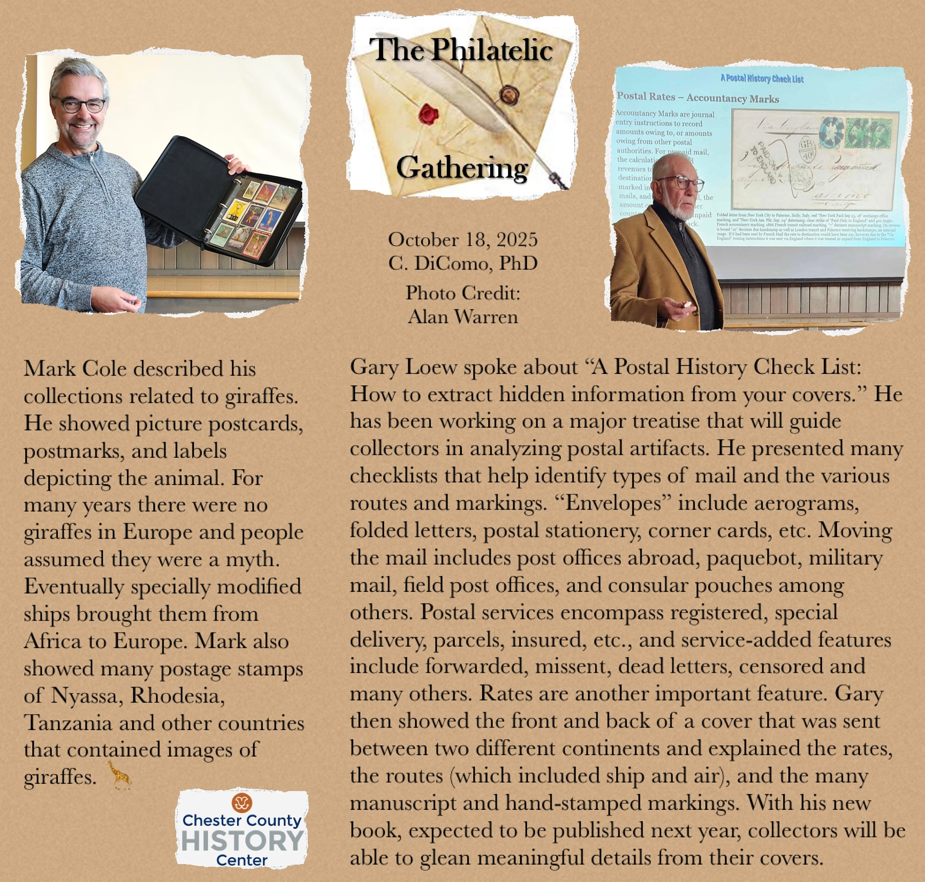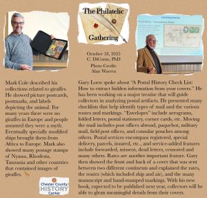In January 2019, seventeen stamp and postal history collectors, researchers and historians convened at Bill and Patricia Schultz’ home in West Chester, PA to discuss how “To Share our Love of Philately with Others”. Also in attendance, Ellen E. Endslow, Director of Collections/Curator from the Chester County History Center. From this initial meeting, “The Philatelic Gathering” was formed to explore and share a myriad of topics and create new philatelic friendships.