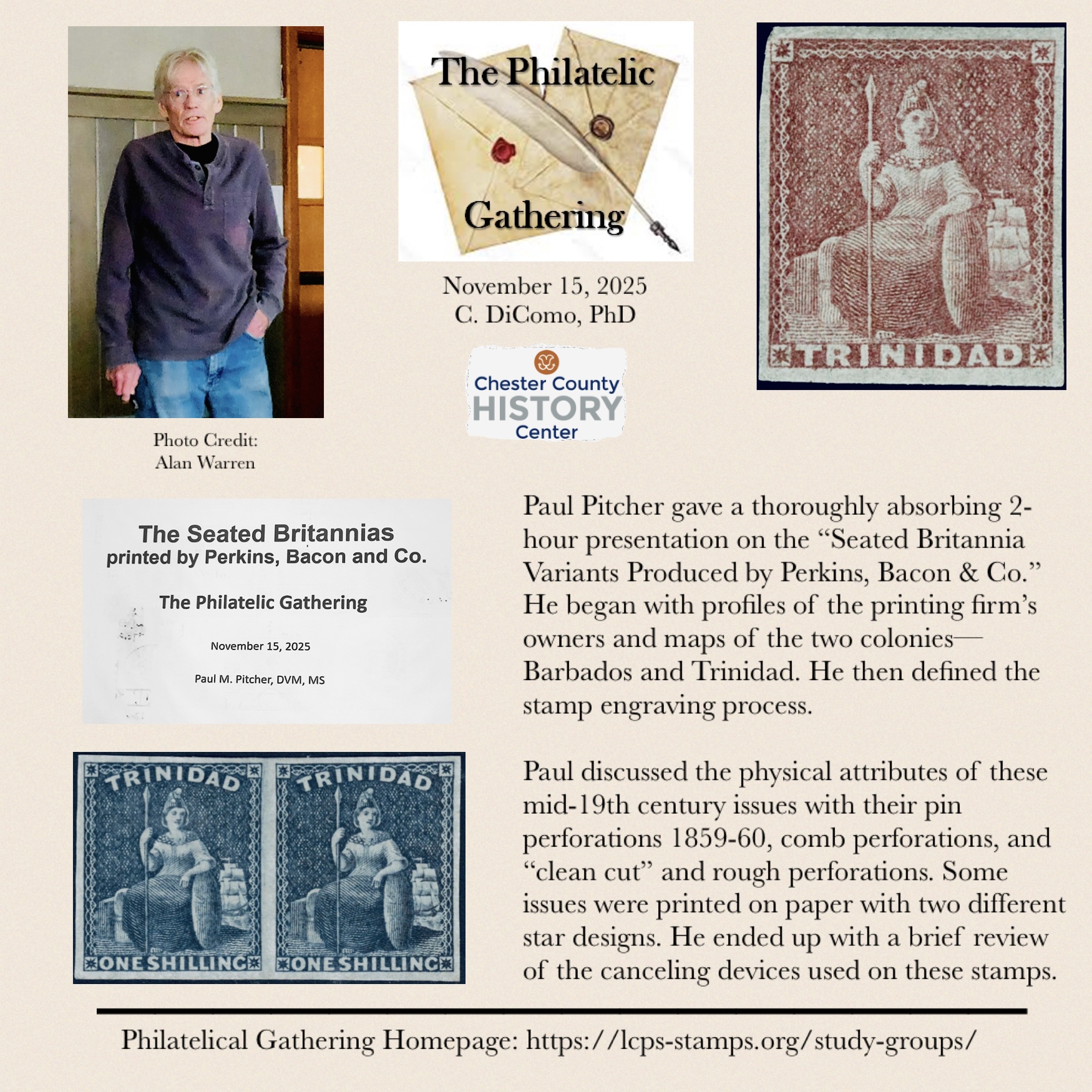 On November 15, 2025, Paul Pitcher gave a thoroughly absorbing 2-hour presentation on the PDF Mini-Icon “Seated Britannia Variants Produced by Perkins, Bacon & Co.” at the Chester County History Center. He began with profiles of the printing firm’s owners and maps of the two colonies—Barbados and Trinidad. He then defined the stamp engraving process. Paul also discussed the physical attributes of these mid-19th century issues with their pin perforations 1859-60, comb perforations, and “clean cut” and rough perforations. Some issues were printed on paper with two different star designs. He ended up with a brief review of the canceling devices used on these stamps. We look forward to seeing everyone in 2026. Make it a relaxing a joyous holiday season.